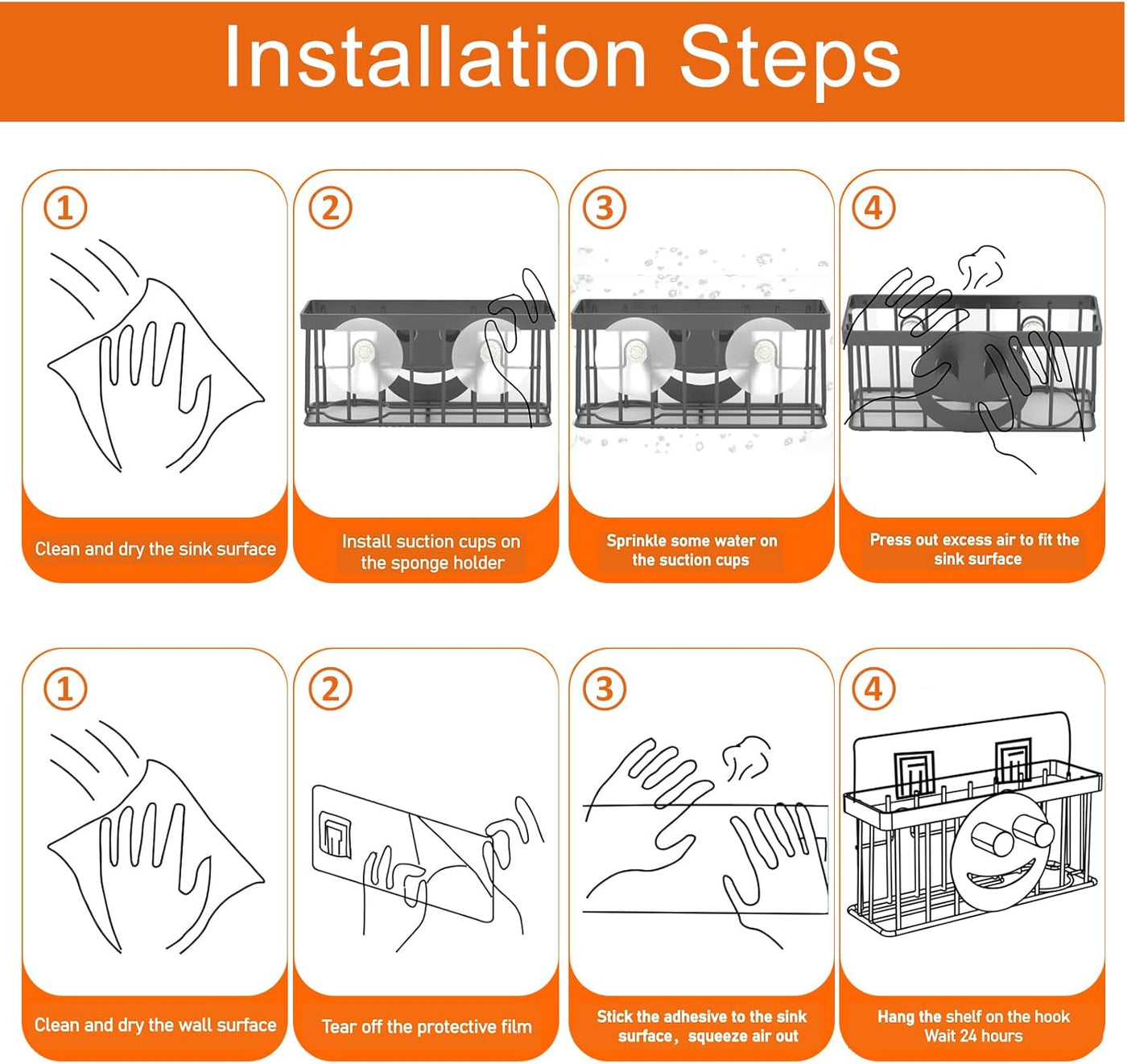 TWO DIFFERENT INSTALL METHODS: Our sponge caddy comes with 1 suction cup and 1 adhesive strip. Choose the method of installation based on your requirements. Applicable for kitchen walls ( smooth and neat), can also be applicable for in sink, smooth tiles/marble tiles/glass/metal walls and, etc.