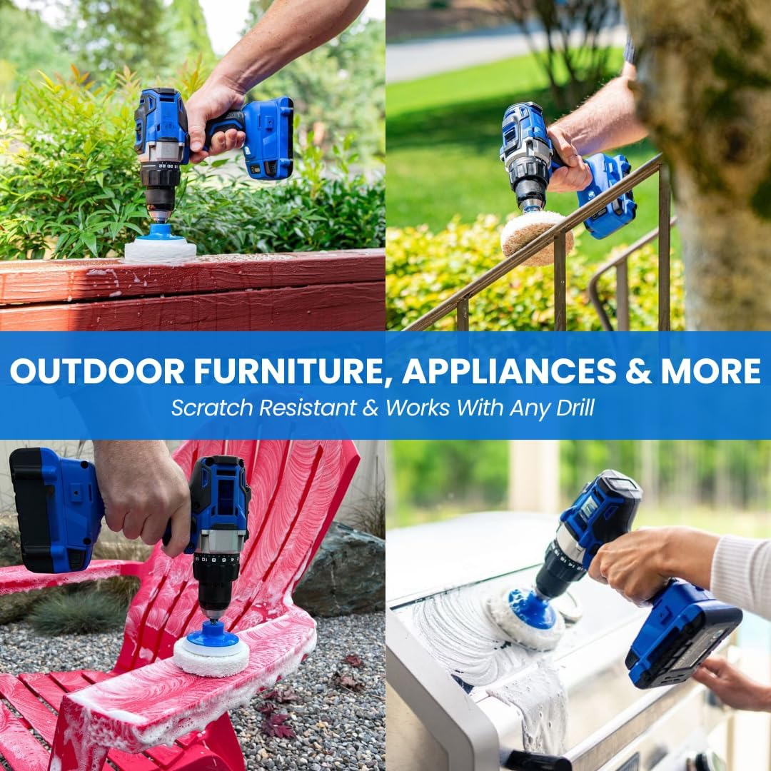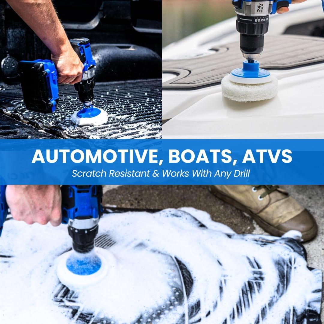 Includes 6 Reusable Scrub Pads: 7-piece kit includes velcro backing pad and 6 oversized non-scratch nylon spin scrubber scour pads, which can be used on both sides for 2X longer life (Drill NOT Included).