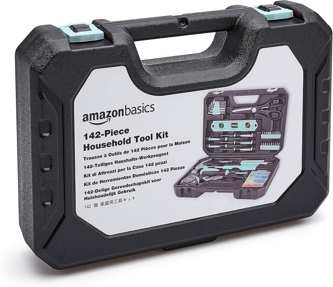 Includes a hammer, level, auto-lock tape measure, pliers, precision screwdrivers and bits, hex key wrenches, scissors, utility knife, and a hardware kit—everything organized in one compact set.