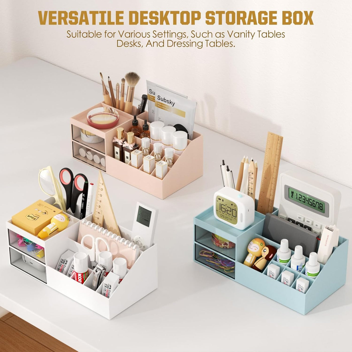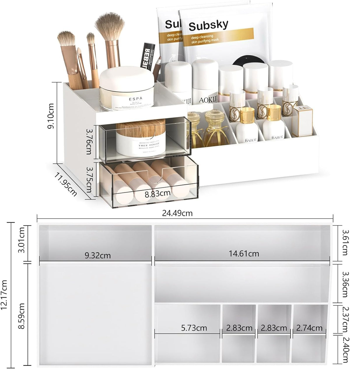 【Perfect Size】 Measuring 9.65''L x 4.8"W x 3.67"H, this cosmetic organizer features 10 versatile compartments and two drawers, making it an ideal make up organizer for counter and cosmetic storage organizer.
