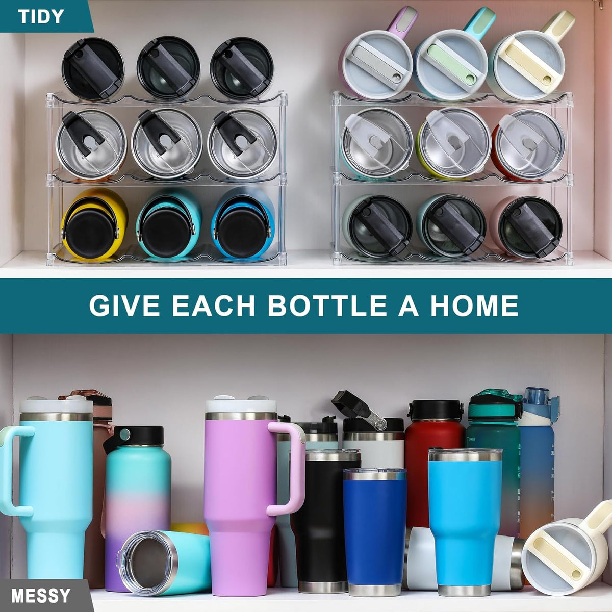 ★Simple 3-Tier Bottle Storage Holder Rack - Size: 13.5" L x 7.8" W x 9.5" H, hold 9 bottles. Modern, stylish and chic design complements any interior. Fits most household water bottles or tumblers, like glass or plastic water bottles, sport bottles, insulated travel mugs or tumblers, baby bottles, kids sippy cups and many more. Ridges on both sides prevent bottles from rolling and give each bottle a room.