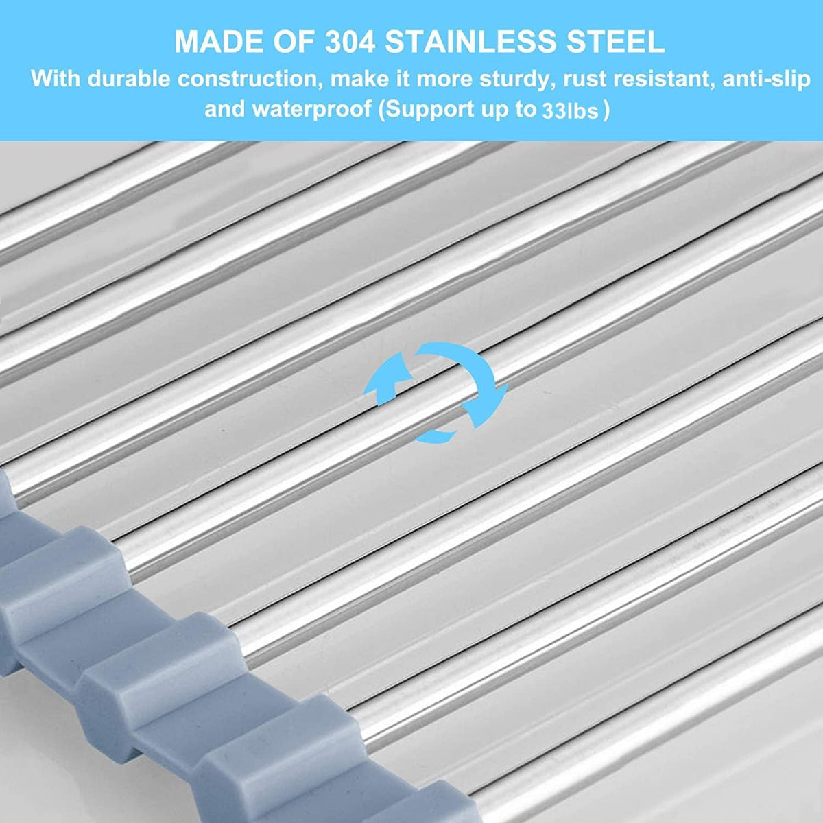 HIGH QUALITY : Made of 304 Stainless Steel with sturdy construction, the collapsible cutting board over sink is sturdy, rust resistant,non-slip, waterproof; support up to 33lbs, not easy to bend or twist by heavy cookware. A great portable stainless steel rolling rack for apartment essentials and home accessories.