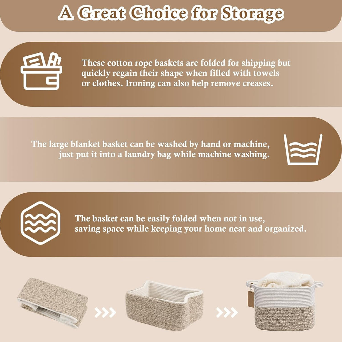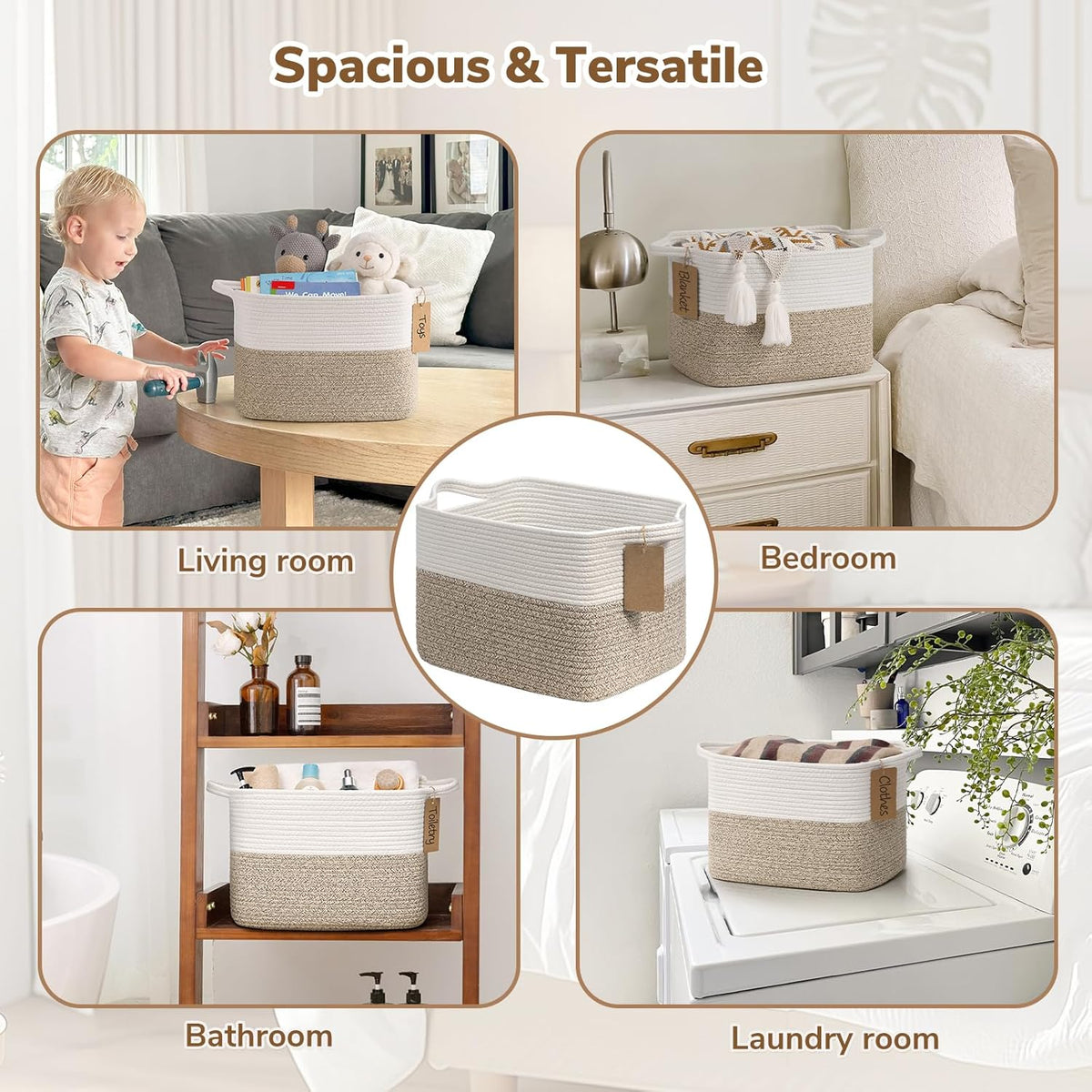 Soft Material. The decorative basket is made of cotton rope with a soft touch, which is perfect for home use, especially for toddlers, babies, children, and pets. It's a smart choice for organizing clothes, toys, stuffed animals, blankets, and even throwing pillows