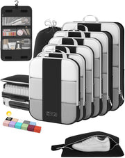This comprehensive set includes four sizes of compression cubes (XL, L, M, S) plus a hanging toiletry bag, shoe bag, laundry backpack, and versatile pouch — everything you need for neat, space-saving packing on business trips, vacations, or extended travels.