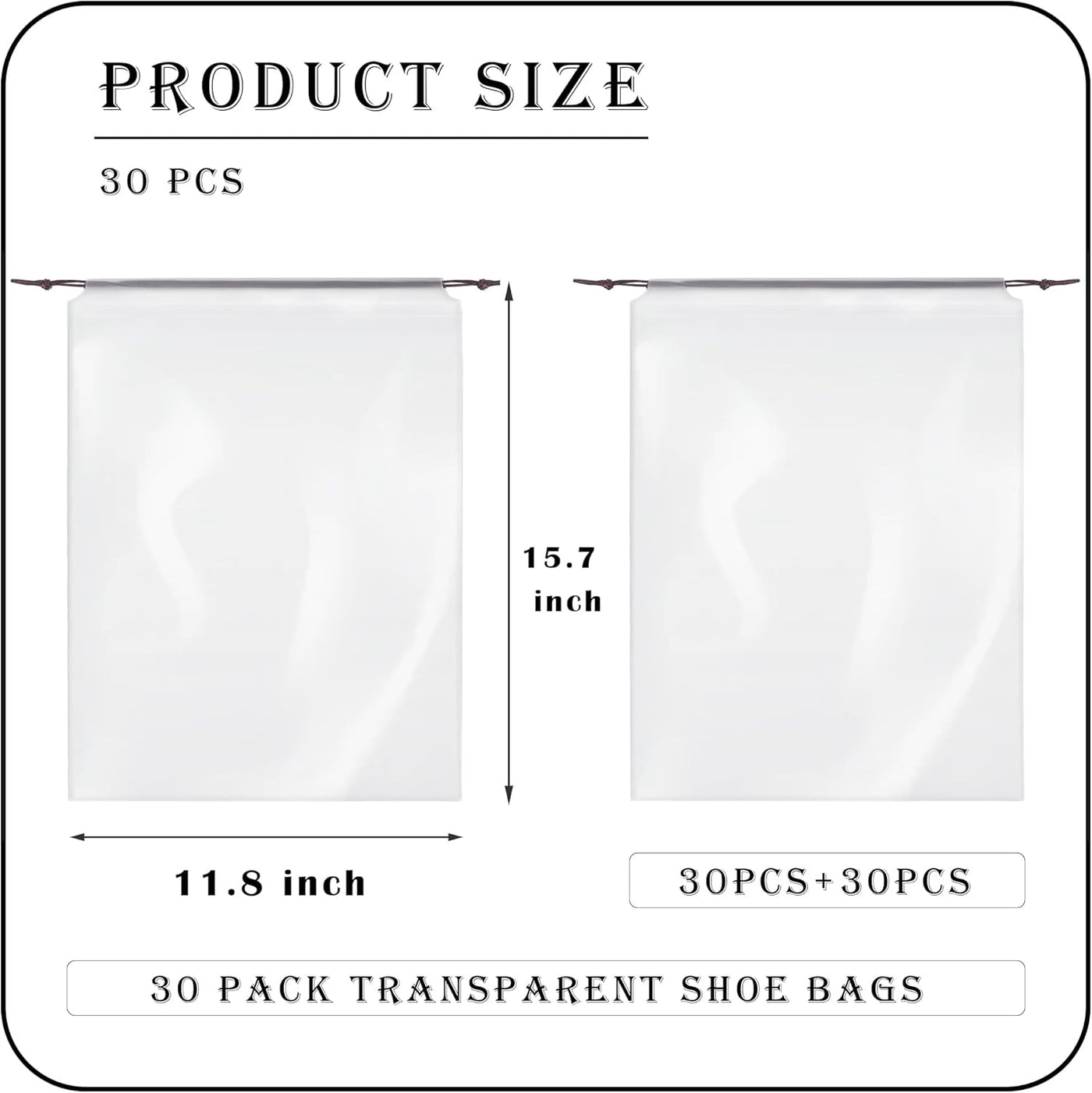 Keep your shoes and travel essentials neatly organized and protected with this convenient 30-pack of clear shoe bags. Each bag measures 15.7” x 11.8” (30 x 40 cm) and features a durable drawstring closure for secure storage.