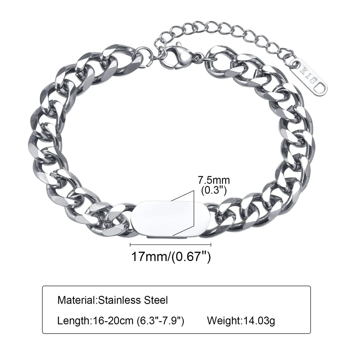 Elevate his style with this sleek Cuban Chain Custom Bracelet for Men, designed with premium stainless steel for durability and a polished silver finish. Featuring 7.8mm wide curb links and a customizable tag with his name or message, this bracelet is perfect for adding a personal touch with a name, initials, or a special message for him, brother or dad.