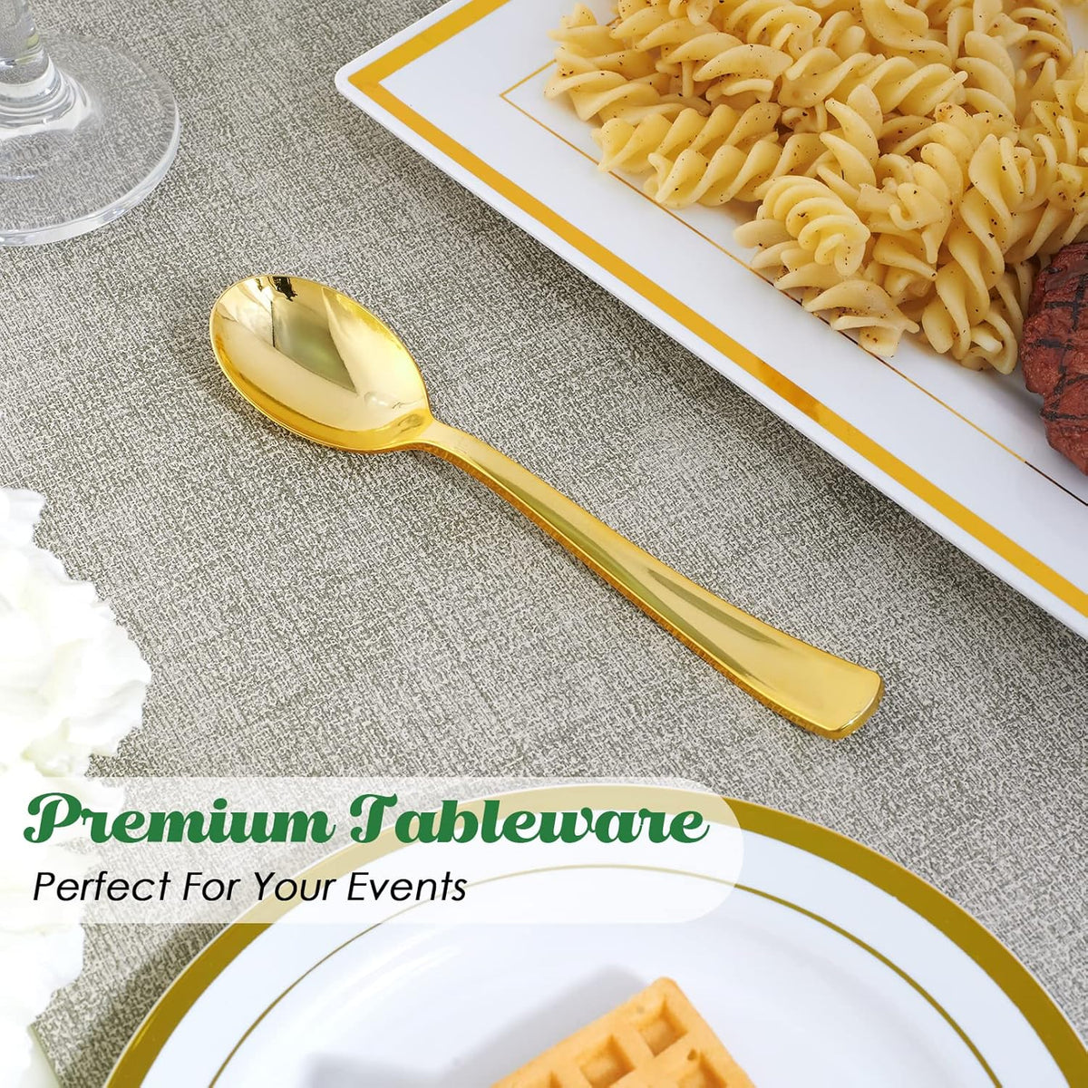 Upgrade your event with this premium 300-pack of 6.8-inch gold disposable plastic spoons, designed to combine elegance and durability. Featuring a smooth, high-reflective gold finish that mimics real metal cutlery, these spoons add a sophisticated touch to weddings, parties, catering events, and dinners. Impress your guests with a chic table setting that’s both stylish and convenient.