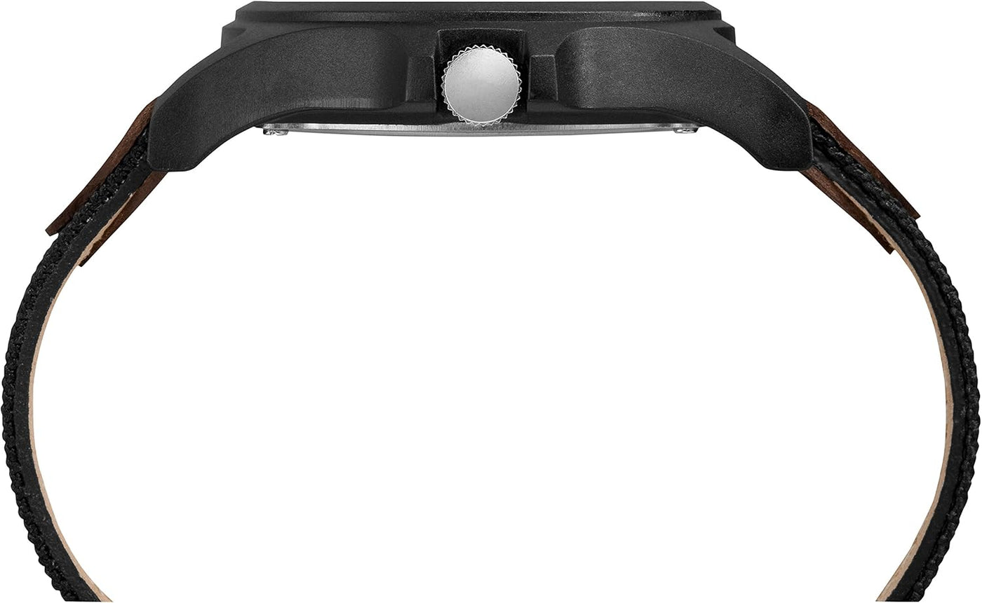 Adjustable black & brown 20 millimeter genuine leather and fabric strap fits up to 8-inch wrist circumference